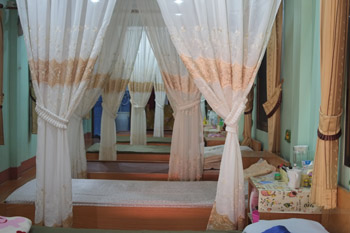 การตกแต่งบ้านพักแห่งนี้ไม่เหมือนสถานบริการสุขภาพอื่นๆ เอาเสียเลย ไม่มีบรรยากาศอึดอัดเคร่งครัด ไม่มีใครแต่งตัวเป็นแพทย์ พยาบาล หรืออยู่ในชุดผู้ป่วย ผ้าปูเตียงไม่มีโลโก้หรือชื่อสถานบริการ ภาชนะมิใช่ถาดหลุม ไม่มีกลิ่นยาฆ่าเชื้อ และเครื่องมือระโยงระยาง ผู้อาศัยไม่ถูกเรียกว่าผู้ป่วย