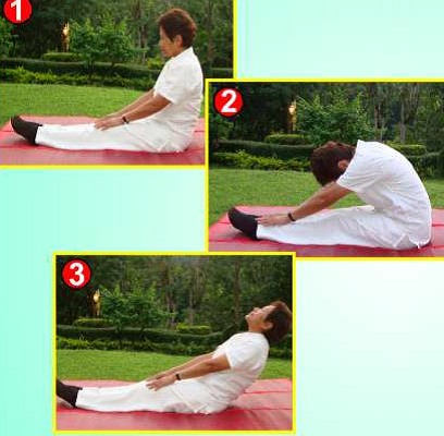 ๓.หายใจออกช้าๆ พร้อมกับค่อยๆ ดึงตัวและแขน เอนไปข้างหลังให้ได้มากที่สุด ค้างไว้สักครู่ นับเป็น ๑ รอบ ทำซ้ำในขั้น ๒-๓ รวม ๓๐ รอบ แล้วค่อยๆ ลืมตาขึ้น