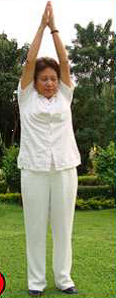 ให้ฝึกหายใจในท่าชูแขนเหนือศีรษะเช่นนี้รวม ๓๐ รอบ แล้วค่อยลืมตาขึ้นช้าๆ ค่อยๆ แยกฝ่ามือออกจากกัน พร้อมกับหายใจปกติ ๓๐ รอบ ค่อยๆ ลดมือลงในท่าหงายฝ่ามือ หายใจเข้าออก ๑ รอบลดลง ๑ จังหวะ จนกระทั่งฝ่ามือลดลงมาถึงต้นขา ขยับเท้ามาชิดกัน ยืนปกติ