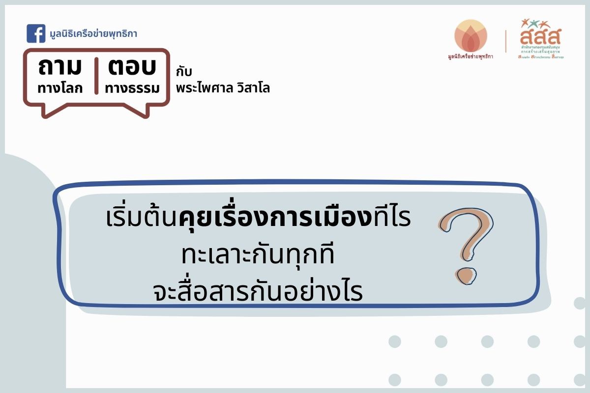 1. ที่บ้านโยมมีปัญหา พอเริ่มต้นคุยเรื่องการเมือง มักคุยกันไม่ได้ แบ่งแยกออกมาเป็นหลายฝ่าย เริ่มต้นคุยทีไรทะเลาะกันทุกที ผู้ใหญ่ก็บอกอาบน้ำร้อนมาก่อน เห็นปัญหามาก และรู้ดี ฝ่ายที่อายุน้อย ก็บอกว่า ทำไมไม่ยอมฟังความคิดเห็นกันบ้าง น่าจะเปิดใจยอมรับความคิดเห็น รับรู้อะไรใหม่ๆ (และพูดเรื่องอื่นๆ อีกมากมาย) ไม่งั้นแล้วจะพัฒนากันยังไง จนบรรยากาศในบ้านอึมครึม โยมก็จนปัญญา ไม่รู้จะสื่อสารกันยังไง