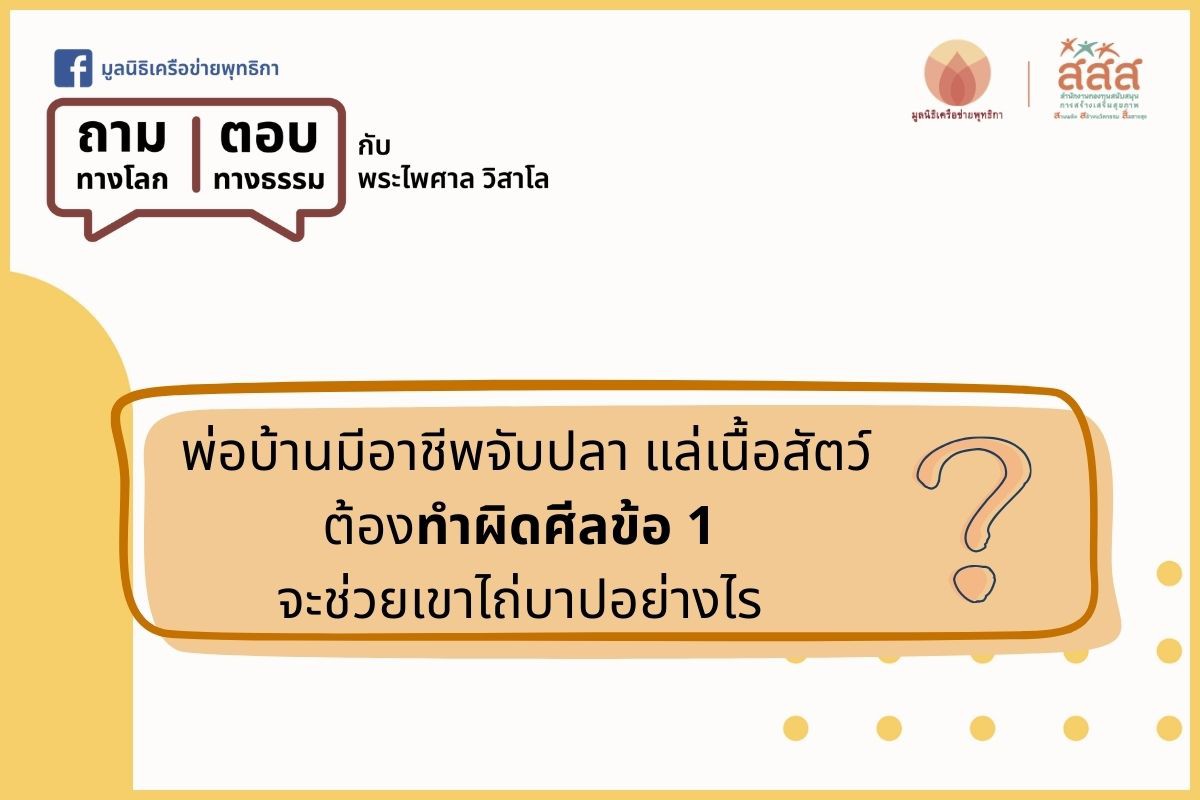 3. พ่อบ้านมีอาชีพจับปลา เป็นคนแล่เนื้อสัตว์ เค้าต้องทำผิดศีลข้อ 1 แต่เป็นการทำเพื่อเลี้ยงดูครอบครัว ต้องทำเพราะเป็นอาชีพ แล้วการกระทำของเขาก็ทำให้ผู้อื่นได้รับผลดีคือได้รับอาหาร แบบนี้เราจะช่วยเค้าไถ่บาปยังไงดีคะ แล้วการที่เรากินเนื้อสัตว์ ถือว่าเราทำผิดศีลข้อ 1 หรือสนับสนุนให้มีการทำผิดศีลข้อ 1 หรือเปล่าคะ เราจะแก้ไขยังไงดีคะจะได้ไม่ผิดศีล ขอบคุณค่ะ