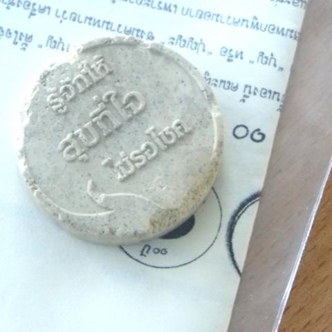 คาถา 3 คำนี้ ปรากฏอยู่บนเหรียญที่ระลึก ในงานครอบรอบ 10 ปี ฉลาดทำบุญ
