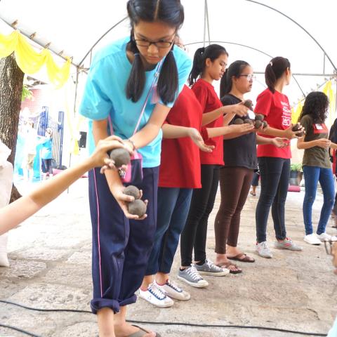 อาสาสมัครในภาพกำลังช่วยกันส่งต่อ ก้อนจุลินทรีย์ (EM Ball) ที่ได้ร่วมกันผสมและปั้นจนสำเร็จ