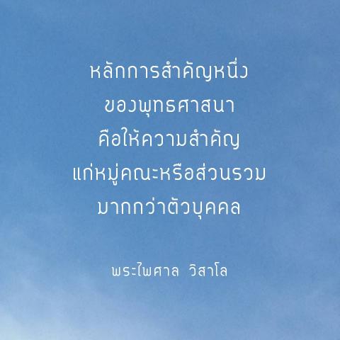 หลักการสำคัญประการหนึ่งของพุทธศาสนาคือ ให้ความสำคัญแก่หมู่คณะหรือส่วนรวมมากกว่าตัวบุคคล ส่วนหนึ่งก็เพราะพุทธศาสนาหรือพระธรรมคำสอนจะยั่งยืนสืบต่อไปได้ก็เพราะหมู่คณะ มิใช่เพราะบุคคลใดบุคคลหนึ่ง แม้ผู้นั้นจะมีคุณวิเศษเพียงใดก็ตาม แต่ก็ต้องมีอันเป็นไปไม่วันใดก็วันหนึ่ง การฝากพระศาสนาไว้กับคนใดคนหนึ่งจึงเป็นเรื่องเสี่ยงอย่างยิ่ง ตรงกันข้ามกับหมู่คณะซึ่งมีการสืบต่อได้ยาวนานกว่า
