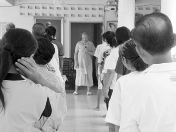 ต่อเมื่อดูแลร่างกายจนถึงที่สุดแล้ว หากร่างกายอยู่ในภาวะสุดท้าย ไม่ตอบสนองต่อยา หลวงตาจะเข้าไปดูแลเรื่องการจิตใจของผู้ป่วยให้สงบเย็น ให้เข้าใจว่าชีวิตเป็นเช่นนั้นเอง แล้วเชิญชวนเพื่อนผู้ป่วยกับญาติมาร่วมสวดมนต์ให้ผู้ป่วยจนกว่าจะไปอย่างสงบ หลับไป โดยทุกอย่างต้องเป็นธรรมชาติ และยืดหยุ่นตามสถานการณ์