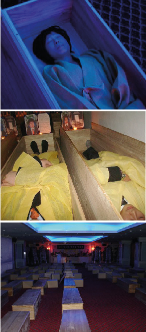 ในห้องมืดที่มีเพียงแสงจากเทียนส่อง โลงศพถูกวางเรียงกันเป็นแถว แต่ละคนค่อยๆ ก้าวลงไปนอนในโลงศพอย่างช้าๆ ในท่านอนราบ และแขนแนบลำตัว ก่อนที่โลงศพจะถูกปิดลงเป็นเวลาราว ๕-๑๐ นาที