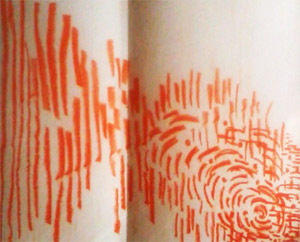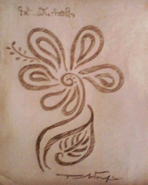 เป็นรูปที่วาดในวันประชุม นำมาให้ดูเพื่อแสดงความรู้สึกจากวันนั้นจนถึงวันนี้ ภาพนี้เริ่มวาดจากทางขวาไปทางซ้าย เส้นโค้งขดเป็นวงวน สื่อถึงความรู้สึกที่ตื่นเต้น ยังควบคุมและปรับตัวเองไม่ค่อยได้ ใจไม่นิ่งกับหลายสิ่งที่ไม่เป็นอย่างที่คิด อย่างเรื่องการเปลี่ยนเคส การต้องเจอสิ่งที่ไม่ทันตั้งตัว และการเข้าหาน้อง แต่เมื่อเวลาผ่านไปจนเรียนรู้ทำความเข้าใจได้ ก็เริ่มนิ่งขึ้น เส้นโค้งเริ่มเปลี่ยนเป็นเส้นตรง ส่วนสีที่ใช้เป็นสีเดียว เพราะเป็นสีที่ชอบ สื่อว่าการได้มาเป็นอาสาเป็นสิ่งที่ชอบ เพียงแต่ช่วงแรกมีปัญหาบ้างแต่สุดท้ายก็ผ่านไปได้