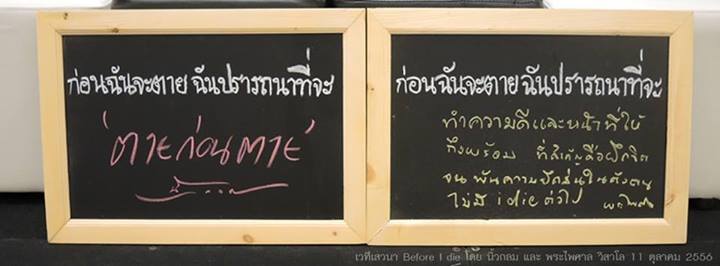 ข้อความที่เขียนบนที่ว่างเหล่านั้นมีความหลากหลาย และน่าประทับใจ ก่อนฉันจะตายฉันปรารถนาที่จะ “ได้กอดลูกอีกครั้งหนึ่ง” ก่อนตายฉันปรารถนาที่จะ “ขอบคุณสามี” ก่อนตายฉันปรารถนาที่จะ “มีดวงตาเห็นธรรม” ก่อนตายฉันอยากจะ “ไปเที่ยวสุราษฎร์ธานี” ฯลฯ