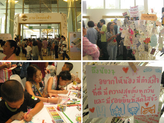 ตลอด ๔ วันที่โครงการสายด่วนฯ จัดกิจกรรม “เขียนการ์ดให้กำลังใจผู้ป่วยเด็กฯ” มีผู้สนใจทุกเพศทุกวัยเข้ามาร่วมเป็นกำลังใจให้กับน้องๆ เกินกว่าที่คาดคิดมาก แม้โดยมากจะใช้เวลาตกแต่งการ์ดด้วยภาพวาดหรือเขียนข้อความให้กำลังเพียงสั้นๆ แล้วนำไปประดับบน “ต้นไม้แห่งความปรารถนาดี” ก่อนจะปลีกตัวไปสัมผัสกิจกรรมอื่นๆ ที่มีมากมายในงาน