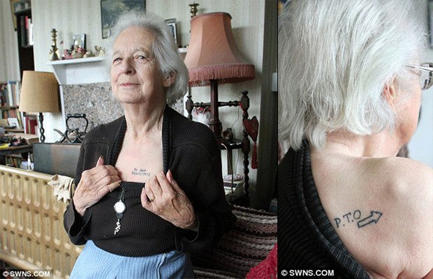 จอยยังสักตัวย่อ 'PTO' (please turn over) และรูปลูกศรไว้ที่ด้านหลัง เพื่อให้หน่วยแพทย์ฉุกเฉินจับเธอพลิกตัวและอ่านข้อความที่สักที่หน้าอก กรณีที่เธอหมดสติในท่านอนคว่ำ