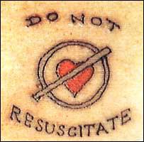 “การกระทำ เช่น การสักข้อความ DNR มาจากความกังวลอย่างลึกซึ้งว่า เจ้าหน้าที่แพทย์พยาบาลอาจไม่เห็นประกาศการตัดสินใจล่วงหน้าในสมุดบันทึกของผู้ป่วย